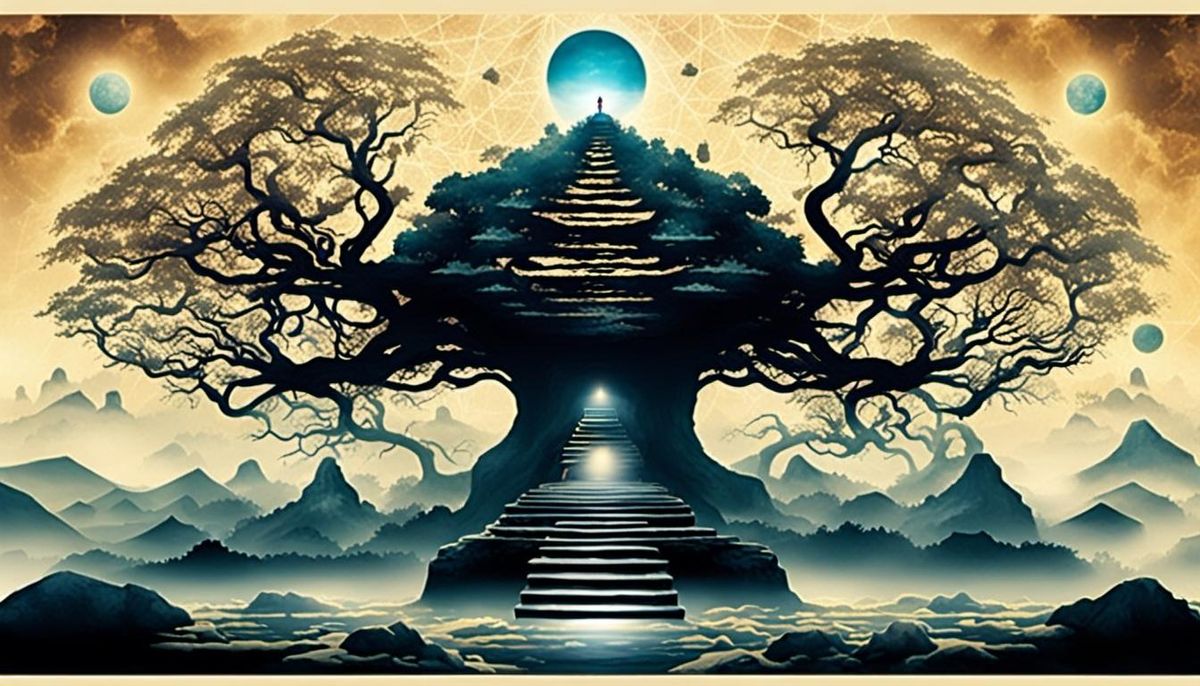 A conceptual image exploring themes of reality, illusion, suffering, and liberation. It conveys the idea that true reality transcends the material world and detachment leads to freedom.