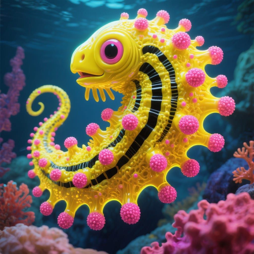 This image shows a surreal, vibrant sea creature. The AI generated art features a bright yellow, neon hybrid of a sea cucumber and sea sponge with pink and black details.