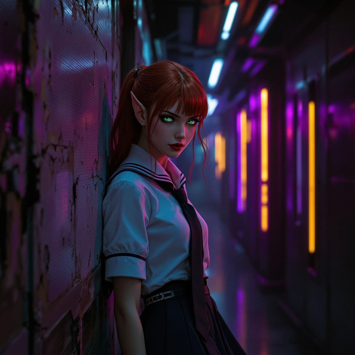 This striking image depicts a fiery elf girl in a crisp school uniform, exuding confidence and attitude as she leans against a worn, metallic wall in a dimly lit, futuristic hallway. Dynamic neon lighting casts vibrant hues across her features, accentuating her striking appearance in a haunting, atmosphe...
