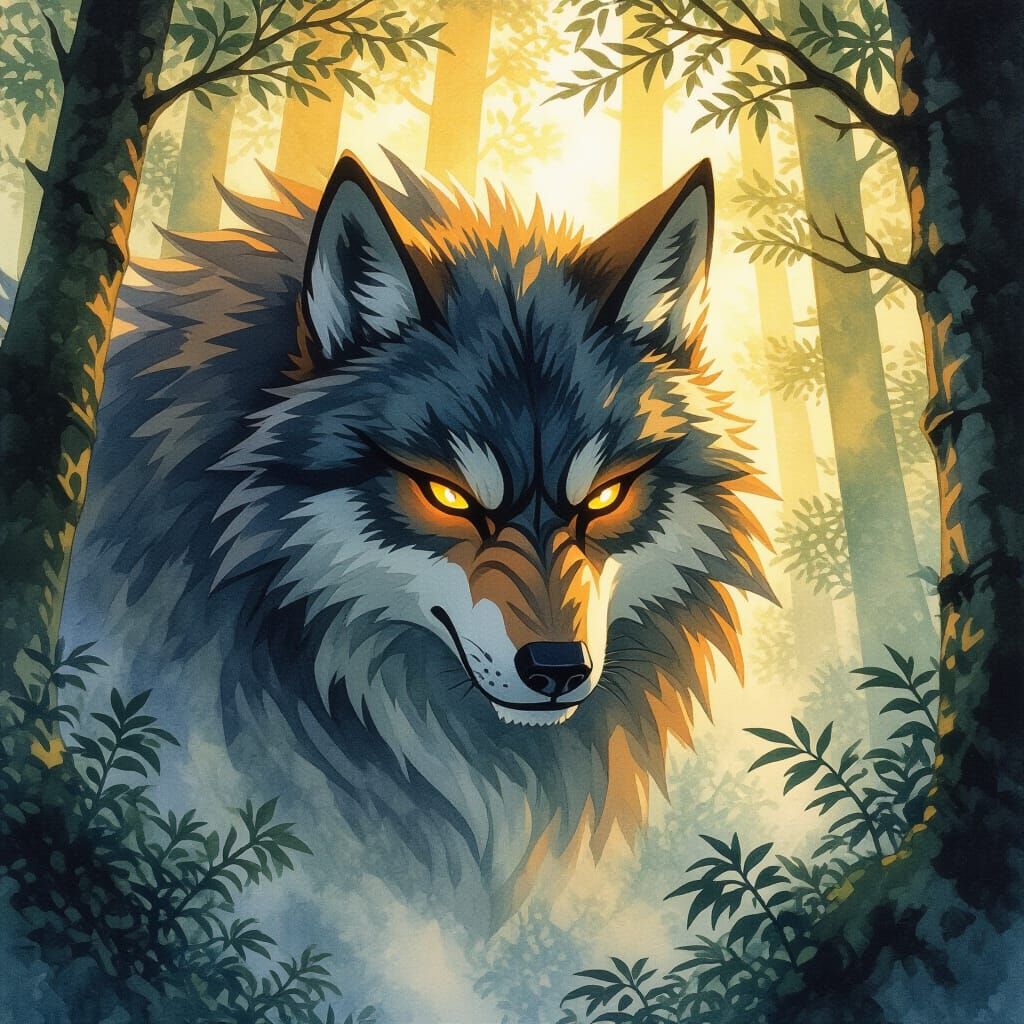 A watercolor painting of Shishigami, a wolf god, in a misty forest. The artwork features soft brushstrokes, warm golden light, vibrant colors, and a serene, mystical atmosphere.
