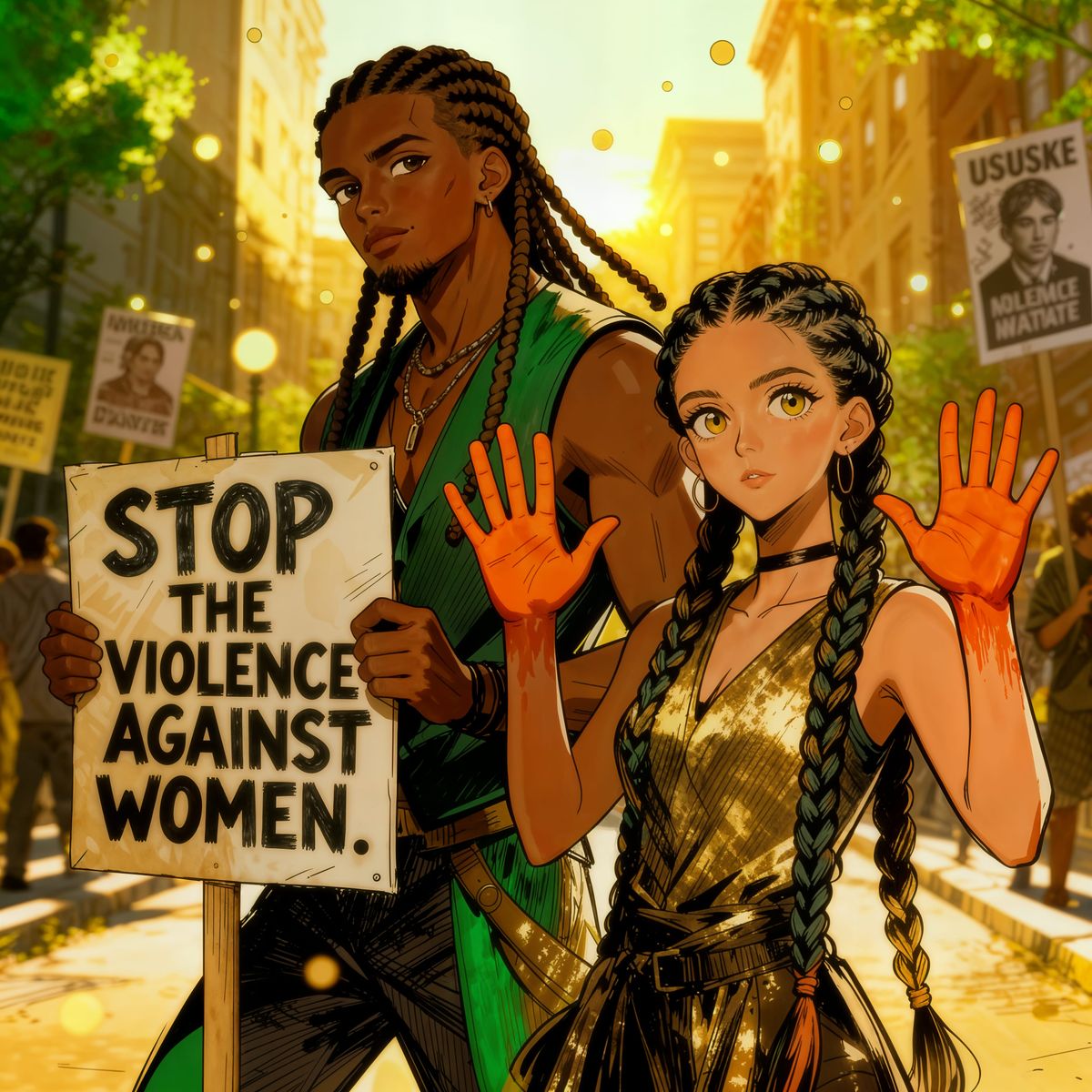 This anime-style portrait features a couple holding a sign against violence. The art uses dynamic line art with crosshatching and bold shading for an emotional and intense masterpiece aesthetic.