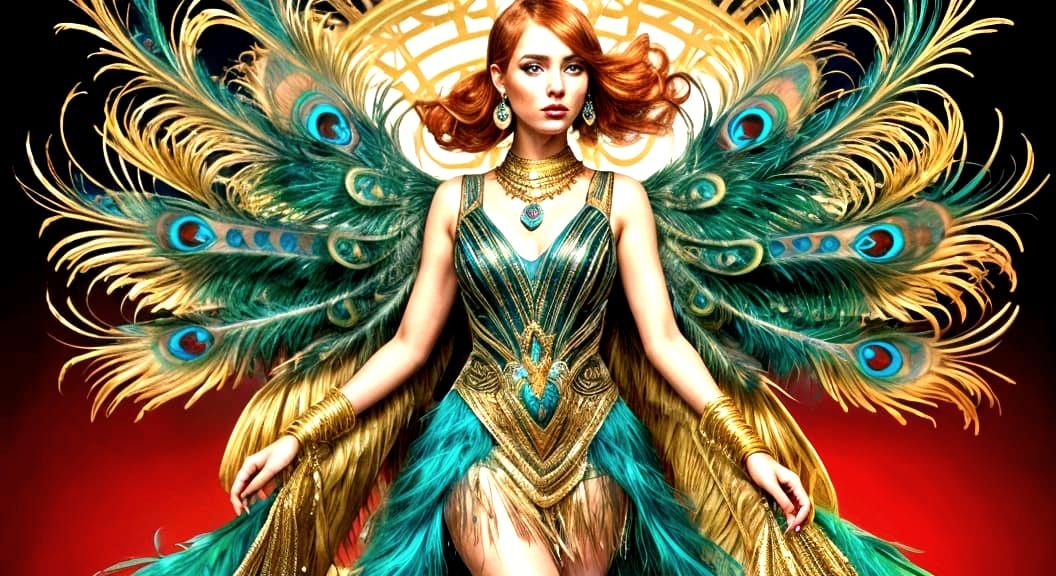 This image shows a young woman in a striking 1920s flapper dress featuring peacock colors, gold accents, feathers, and beaded fringe. The abstract art style highlights fine details and complementary colors.