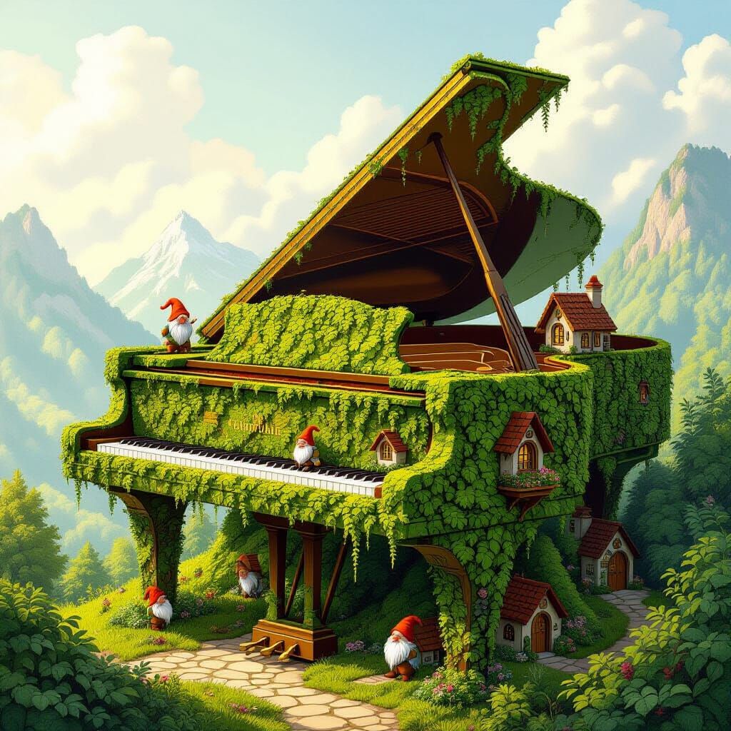 This illustrative image features a giant grand piano transformed into a mountain covered in vines, with cozy dwarf homes built into its sides. Warm sunlight creates an enchanting, storybook atmosphere.