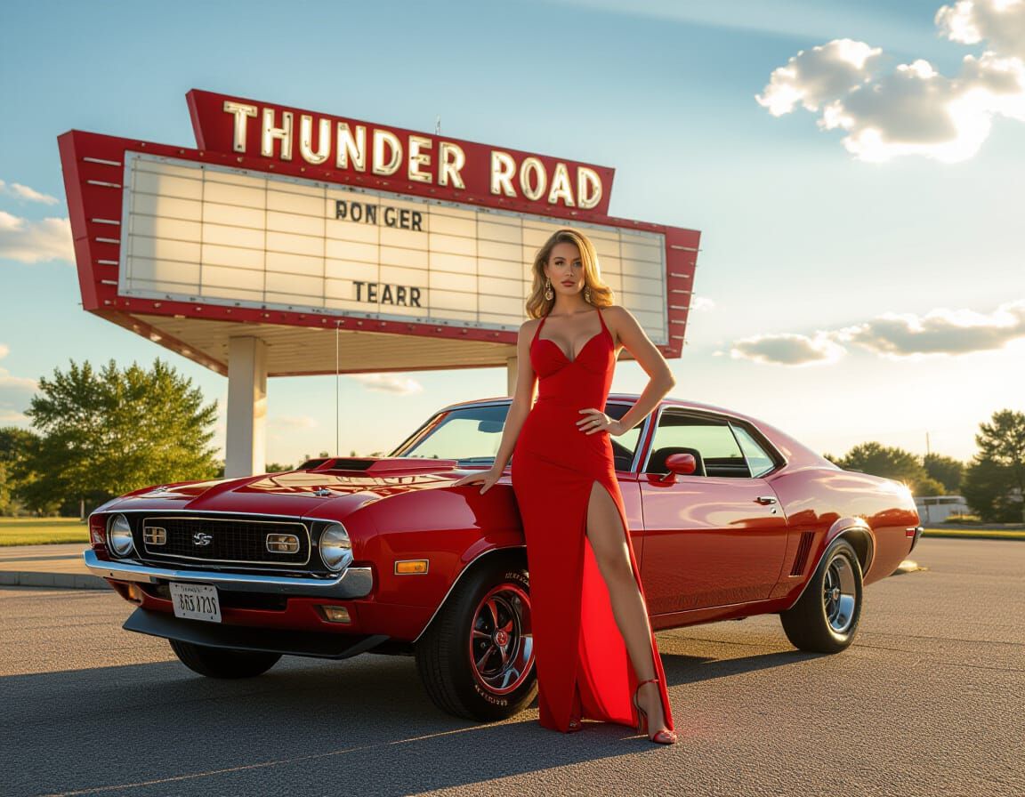 This image features a classic 1970s muscle car and a confident woman in a red dress, parked at a vintage drive-in theater during golden hour. Cinematic lighting highlights the scene with warm tones and reflections.
