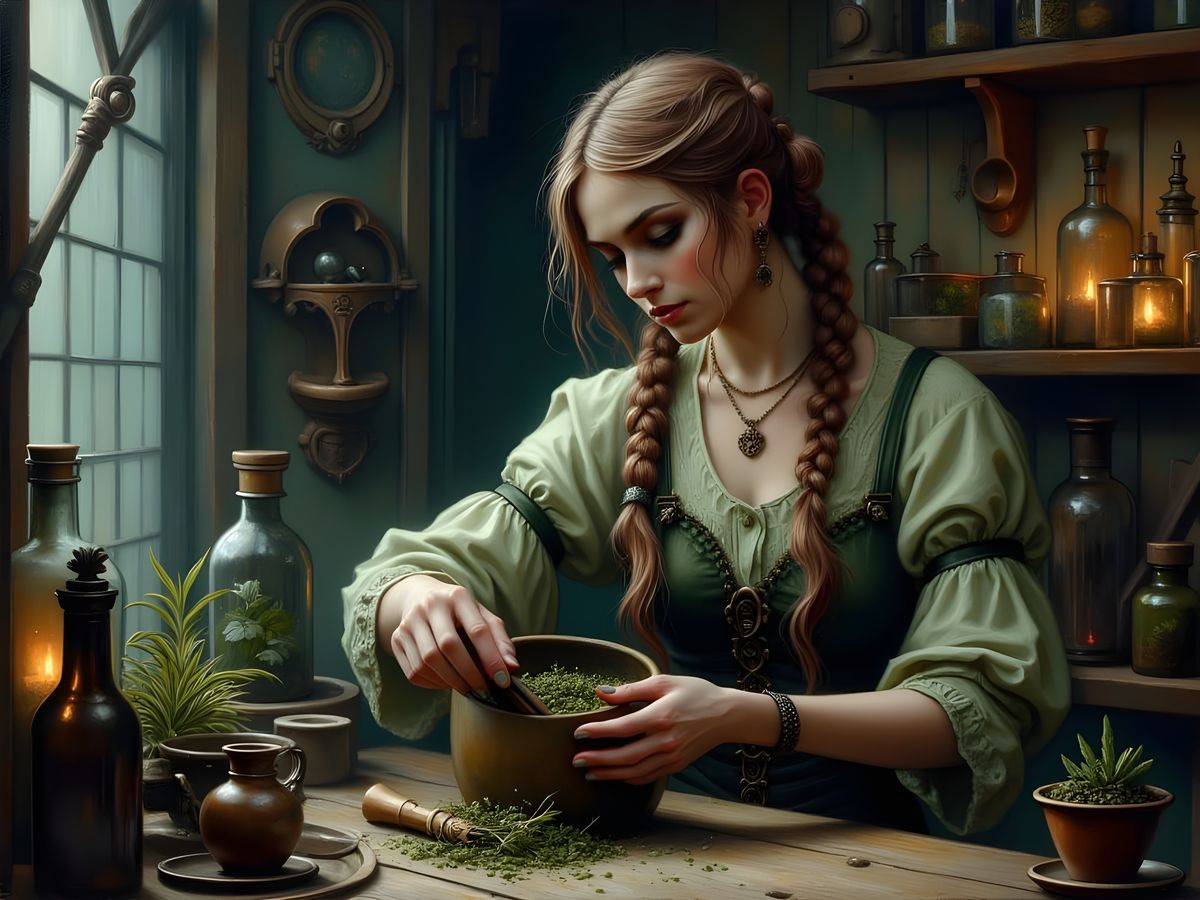 This image depicts a beautiful Norse goddess as an alchemist, grinding herbs in her workshop. The art style is a misty, romantic goth oil painting.