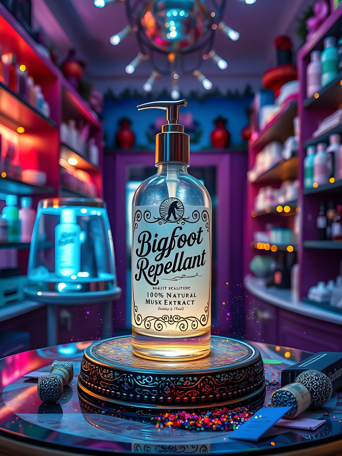 This image shows a beautifully crafted whimsigoth beauty product display with a glowing lotion, set against a colorful background of a hyperrealistic beauty store.