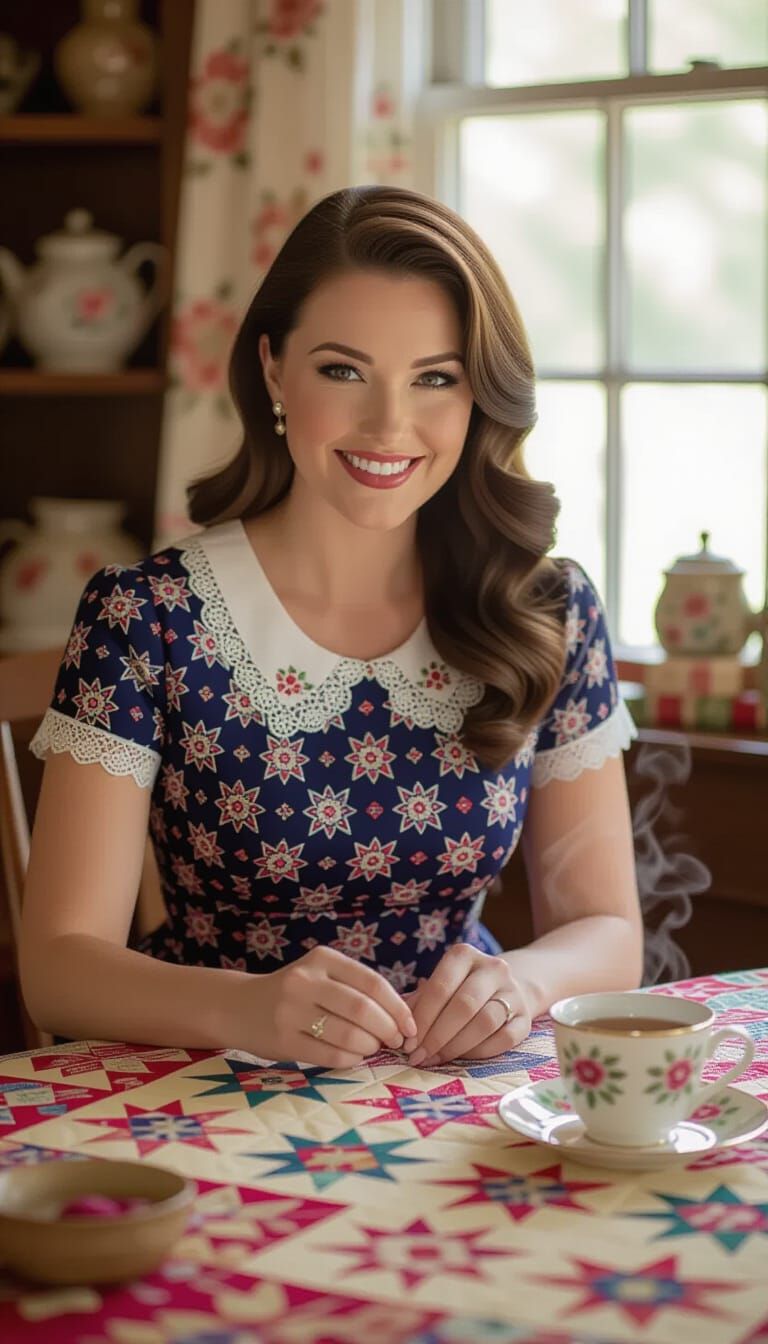 This image shows a woman sewing a quilt. She is smiling and wearing a vintage dress, surrounded by colorful fabric and quilting tools. The shot features a shallow depth of field and warm lighting.