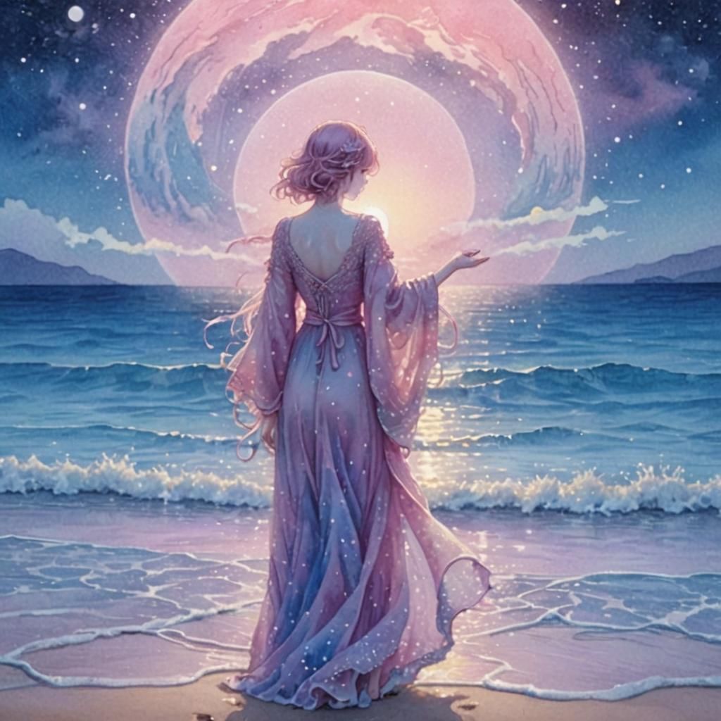 This image shows a pink, ghostly figure made of sand on a moonlit beach. The artwork is reminiscent of classic anime watercolor, with pointillism, intricate linework, and a mystic aura.