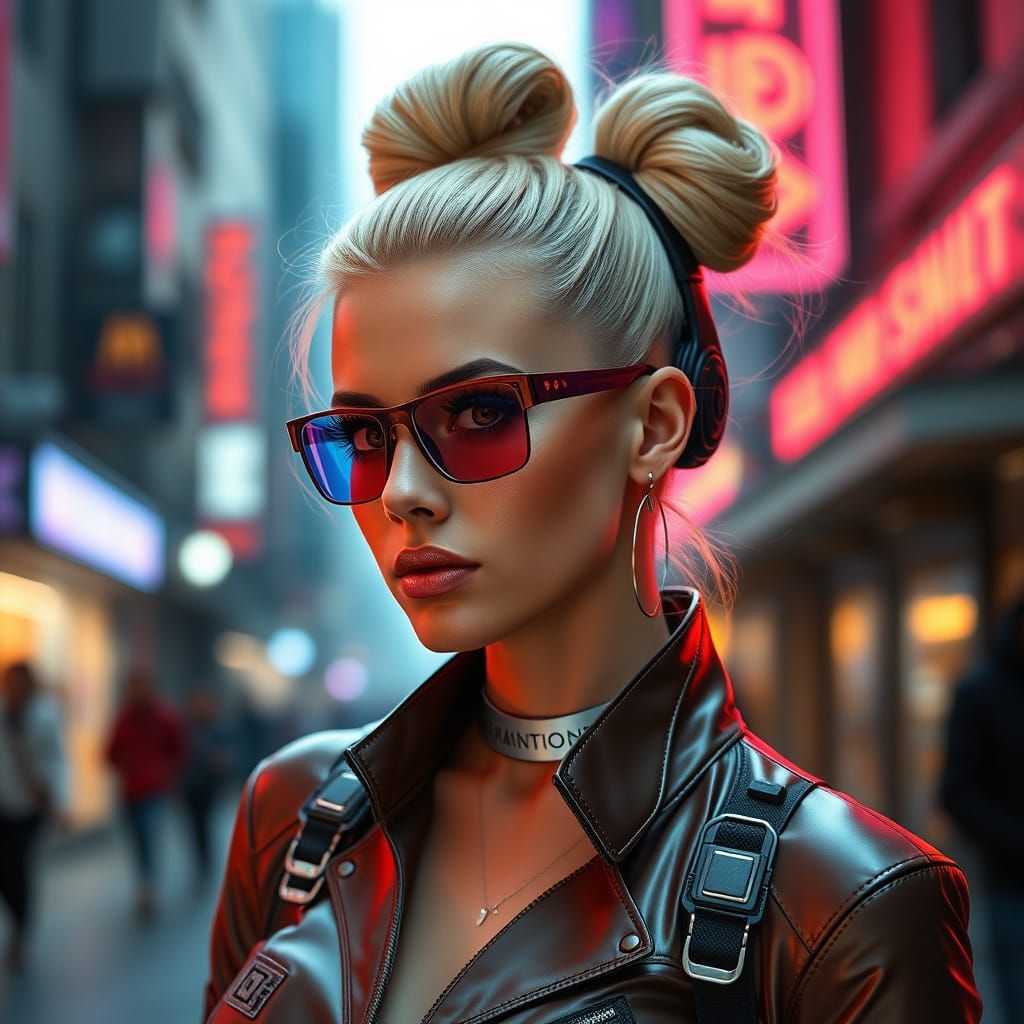A stylish woman with a geometric blonde hairstyle and futuristic outfit stands in a trendy urban setting. The image has subtle neon accents and a cyberpunk aesthetic.