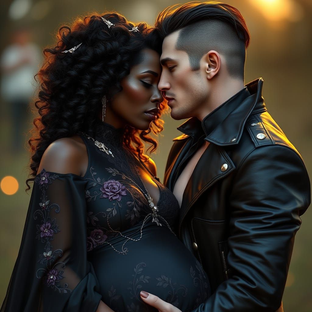 This image shows a romantic, hyper-realistic depiction of a tender vampire couple embracing, set against a soft, golden light. Inspired by Artgerm's textures and Alphonse Mucha's elegance, the piece features high-contrast colors and masterful lighting, blending reality and fantasy.