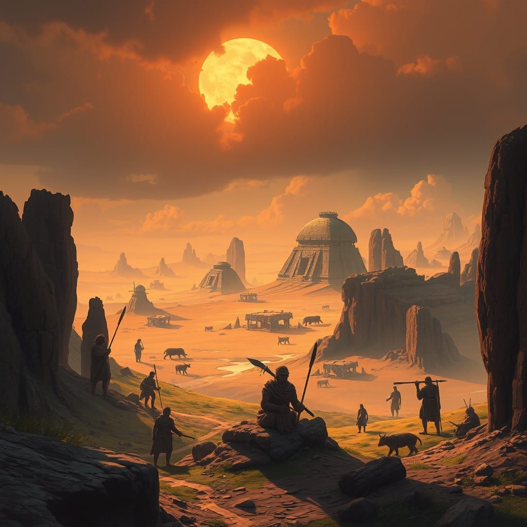A captivating image of an ancient civilization amidst mystic landscapes and primitive weaponry. The artwork features a warm, earthy palette and intricate textures, realized in a retro-futuristic style.