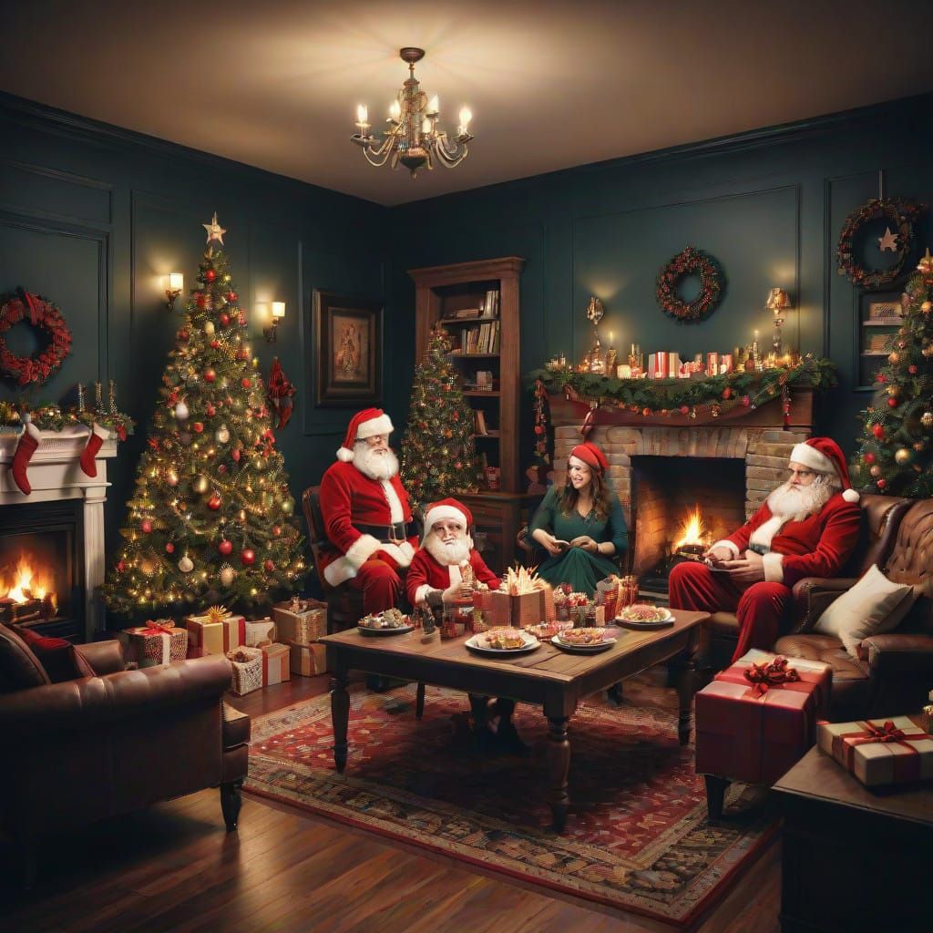 This image captures the joy and warmth of a family Christmas party in a cozy home office setting, with intricate details and vibrant colors that transport you to a magical winter scene.