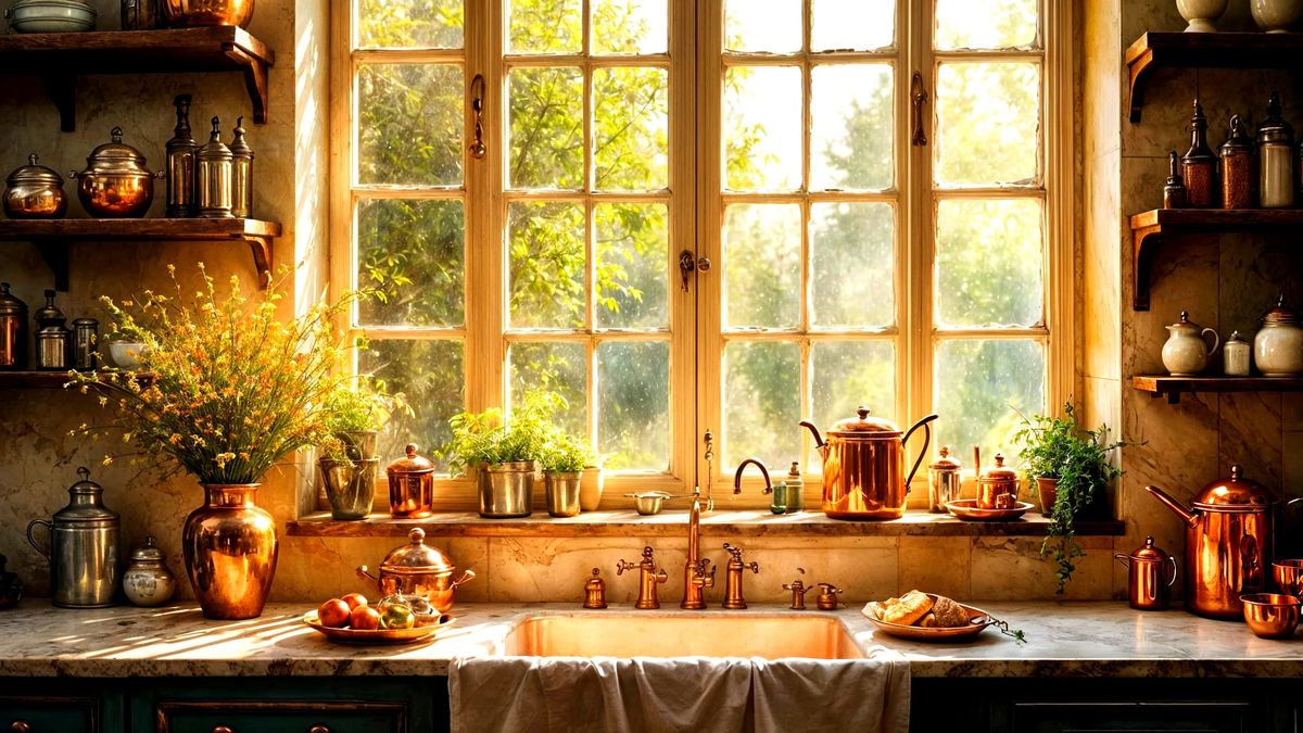 <lora:PR AlcoholWCGlass:1.0> <lora:LuxeVisionsFlux:1.0> <lora:BeautyStrokesV2:1.0> <lora:EtherealVisionsFlux:1.0> A serene kitchen bathed in the gentle glow of early morning light. A neat arrangement of vintage spice jars and copper pots gleams on the counter. The overall atmosphere is one of quiet contemplation ...