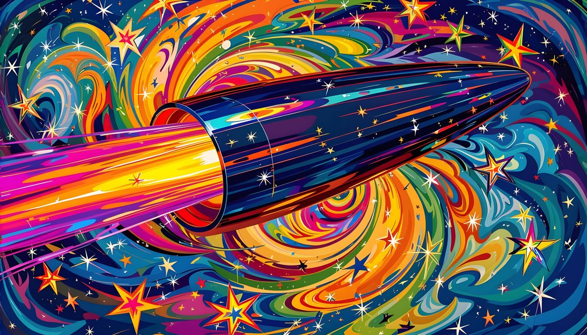 A captivating image of a spinning metallic cylinder emitting iridescent plasma. The art style is reminiscent of Kandinsky and Chagall, featuring vibrant colors, abstract forms, and unbounded motion.