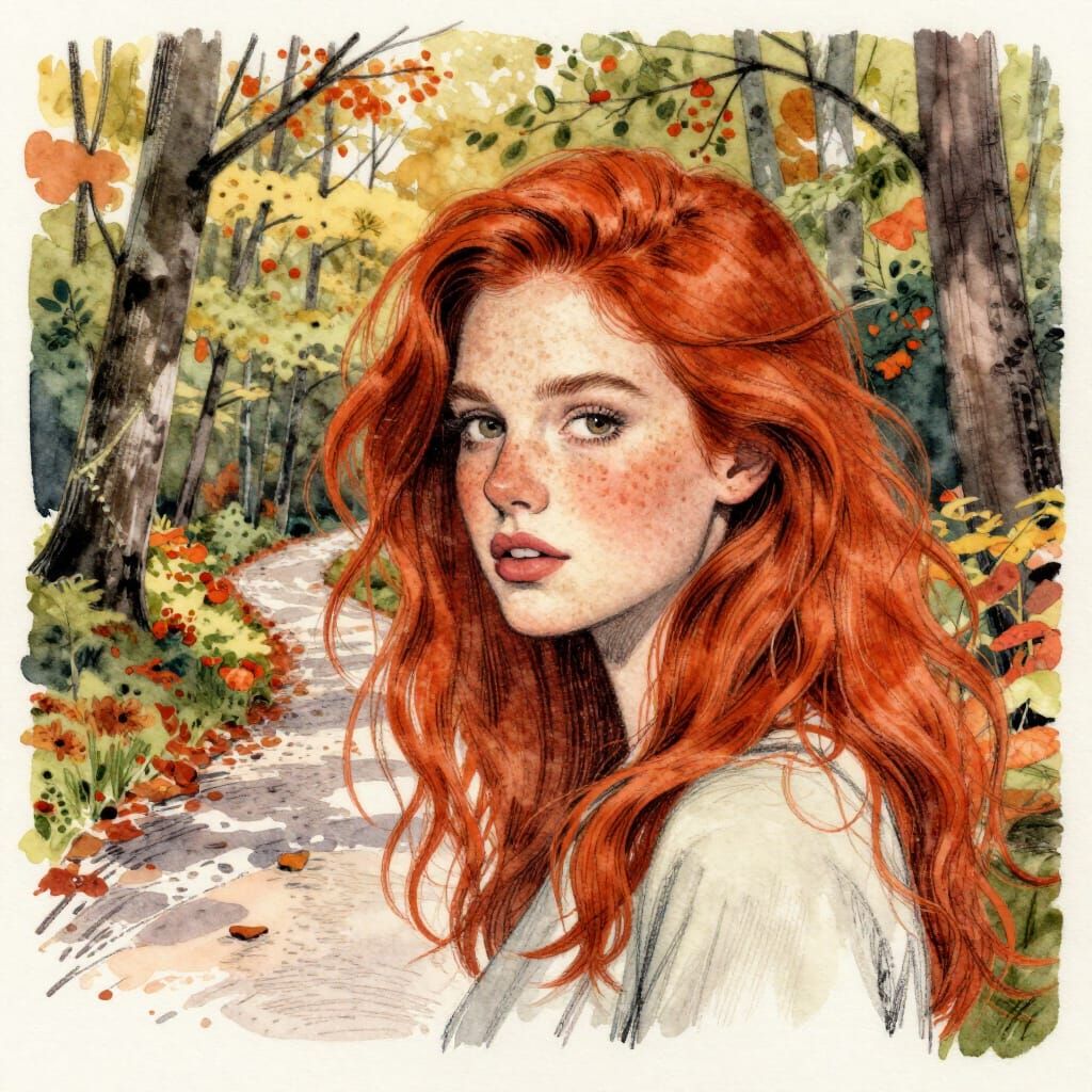 This image shows a beautiful woman with flowing red hair on a forest path surrounded by autumn colors. Created in a watercolour, pointillism, and charcoal sketch style.