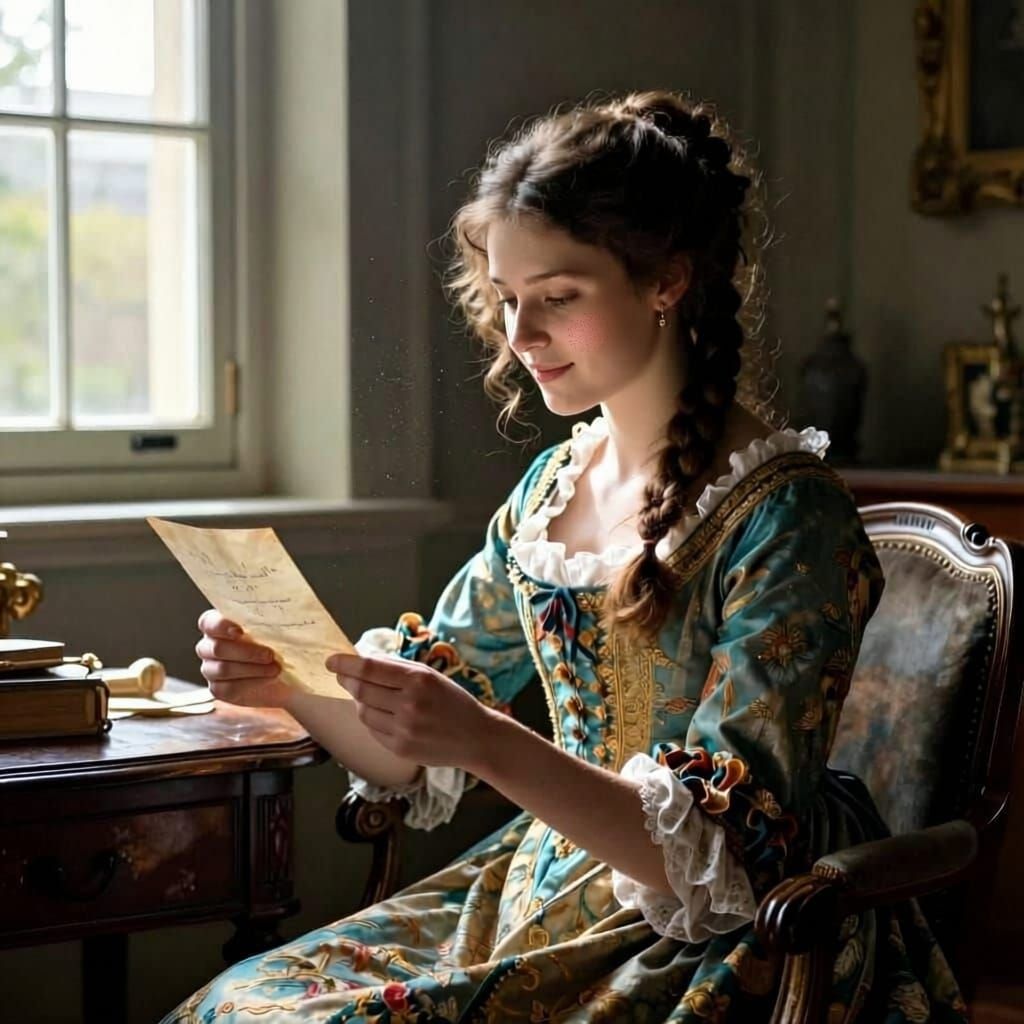 This image shows a detailed oil painting of a young woman from the Regency era reading a letter. She is bathed in sunlight near a window, with dust motes enhancing the scene's rich textures and emotional depth.