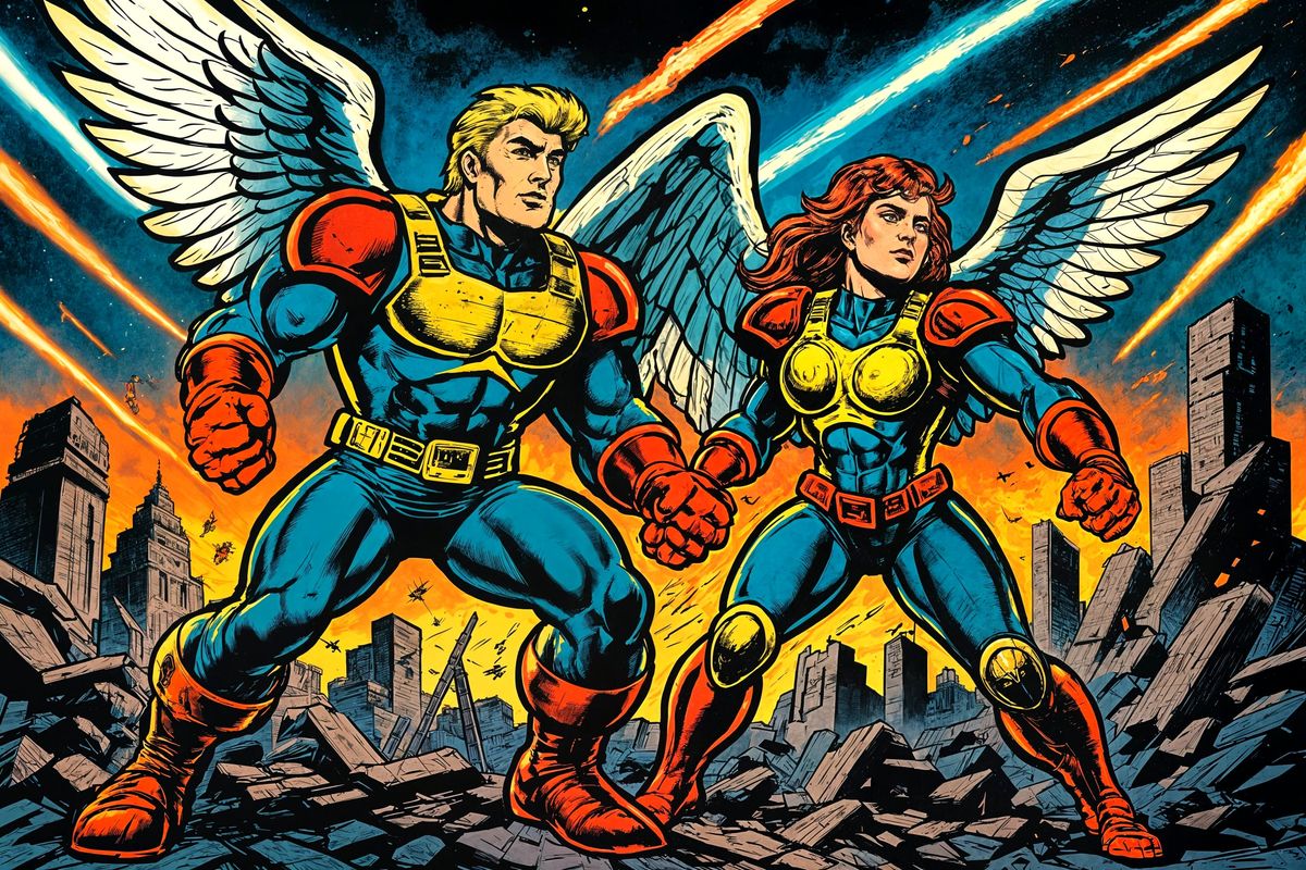 This image depicts two powerful, winged warriors in heroic poses, standing on a war-torn battlefield amidst the ruins of a futuristic city. The artwork is created in a bold, comic book style with vibrant colors and dynamic action.