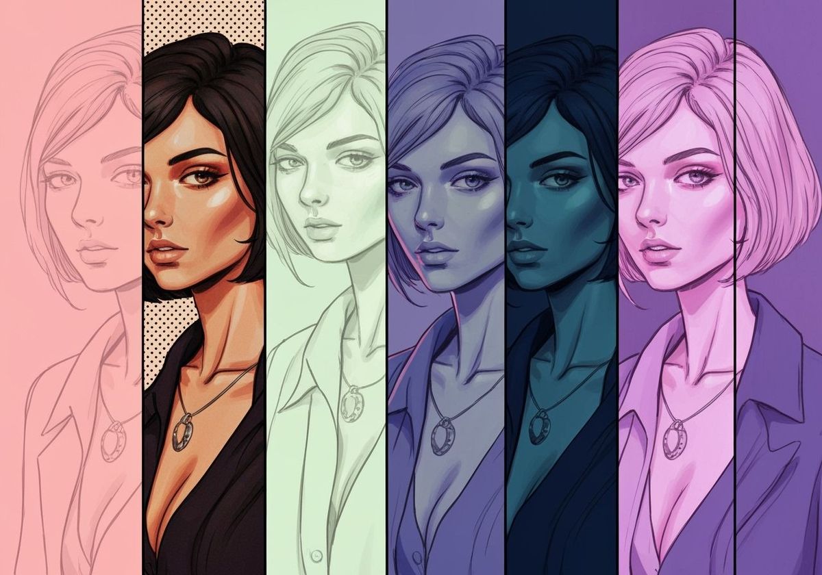 This image shows a portrait of a woman, divided into five vertical segments, each rendered in a unique visual style. The styles include hyperrealism, pop-art, anime, cyberpunk, and minimalist vector design, using pastel colors.