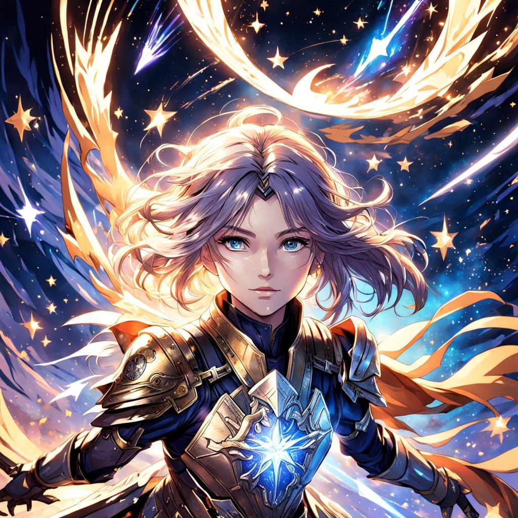 This image shows a determined young woman emerging from a crater, reaching for celestial armor. The cinematic, anime-inspired artwork features vibrant colors, ethereal light, and a soft focus, as a powerful opponent floats in the blurred background.