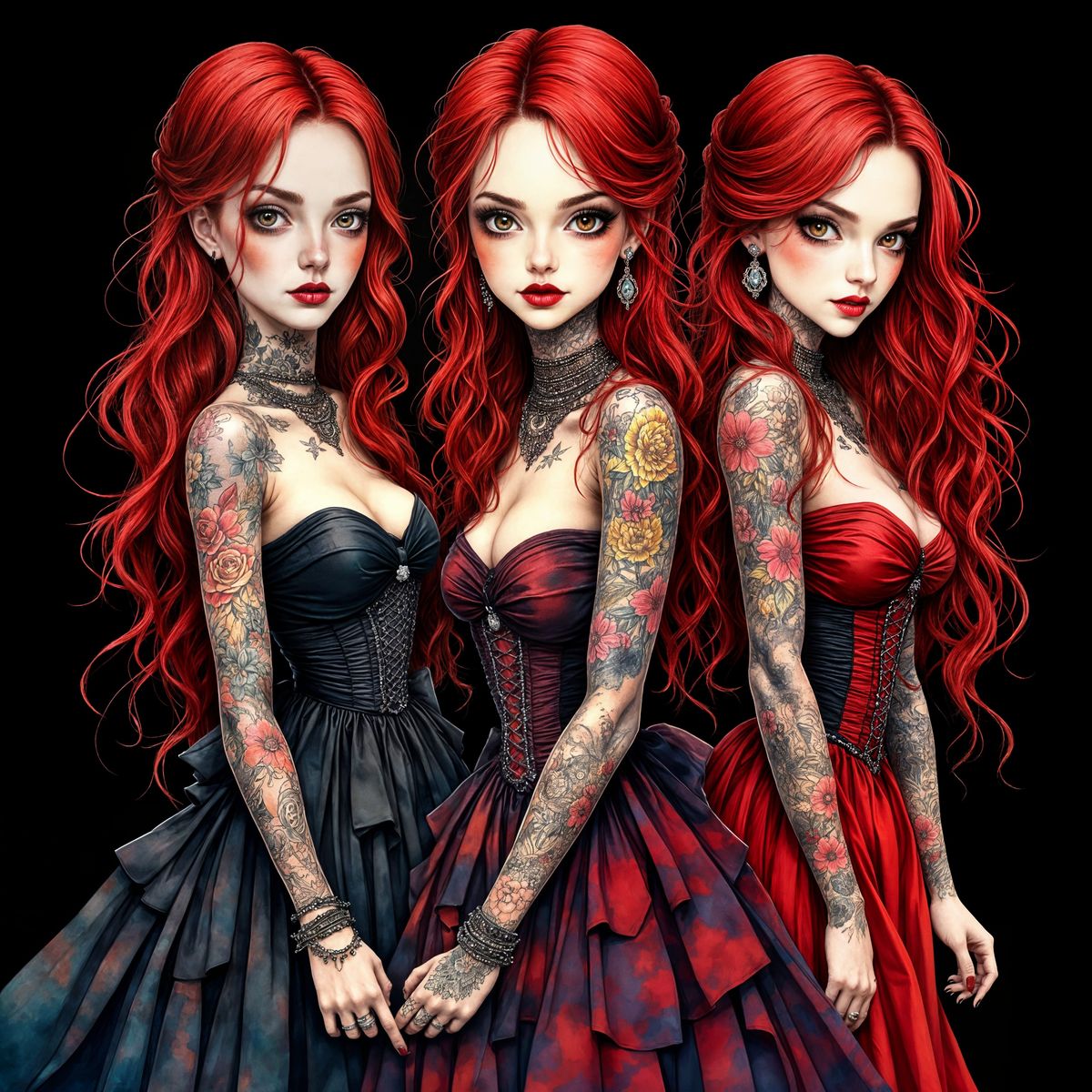 A striking picture of three red-haired girls in elegant attire against a stark black backdrop. The image features bold, graphic lines and intricate tattoo designs in a vibrant, stylized aesthetic.