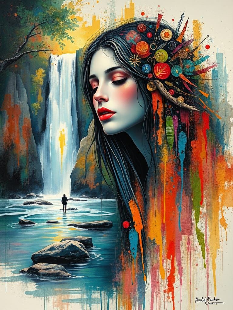 This image shows a colorful and haunting portrait of La Llorona set against a dramatic waterfall backdrop, blending elements of mixed media and poster art.