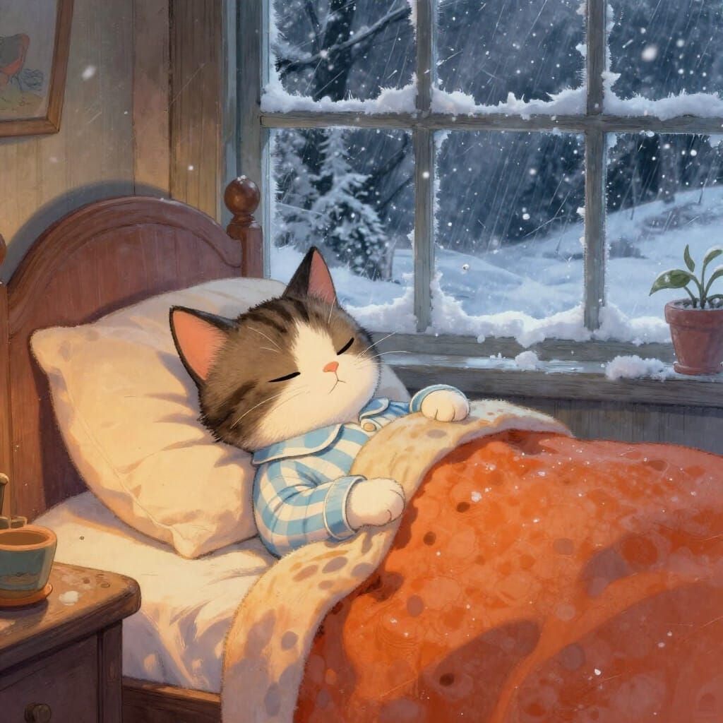 This image shows a cat in pajamas, warm under blankets, while a blizzard rages outside. Rendered in a charming illustrative storybook style with warm interior lighting and vibrant colors.