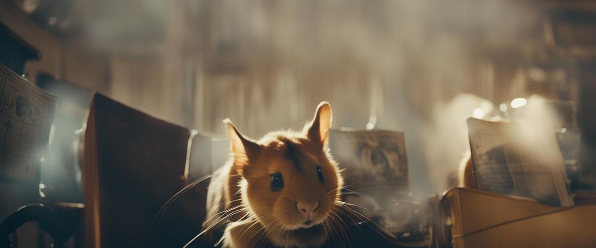 This image shows a woman in a living room noticing a vintage film camera. The scene is lit with warm, golden tones and strong shadows, creating a dramatic, cinematic atmosphere with film grain.