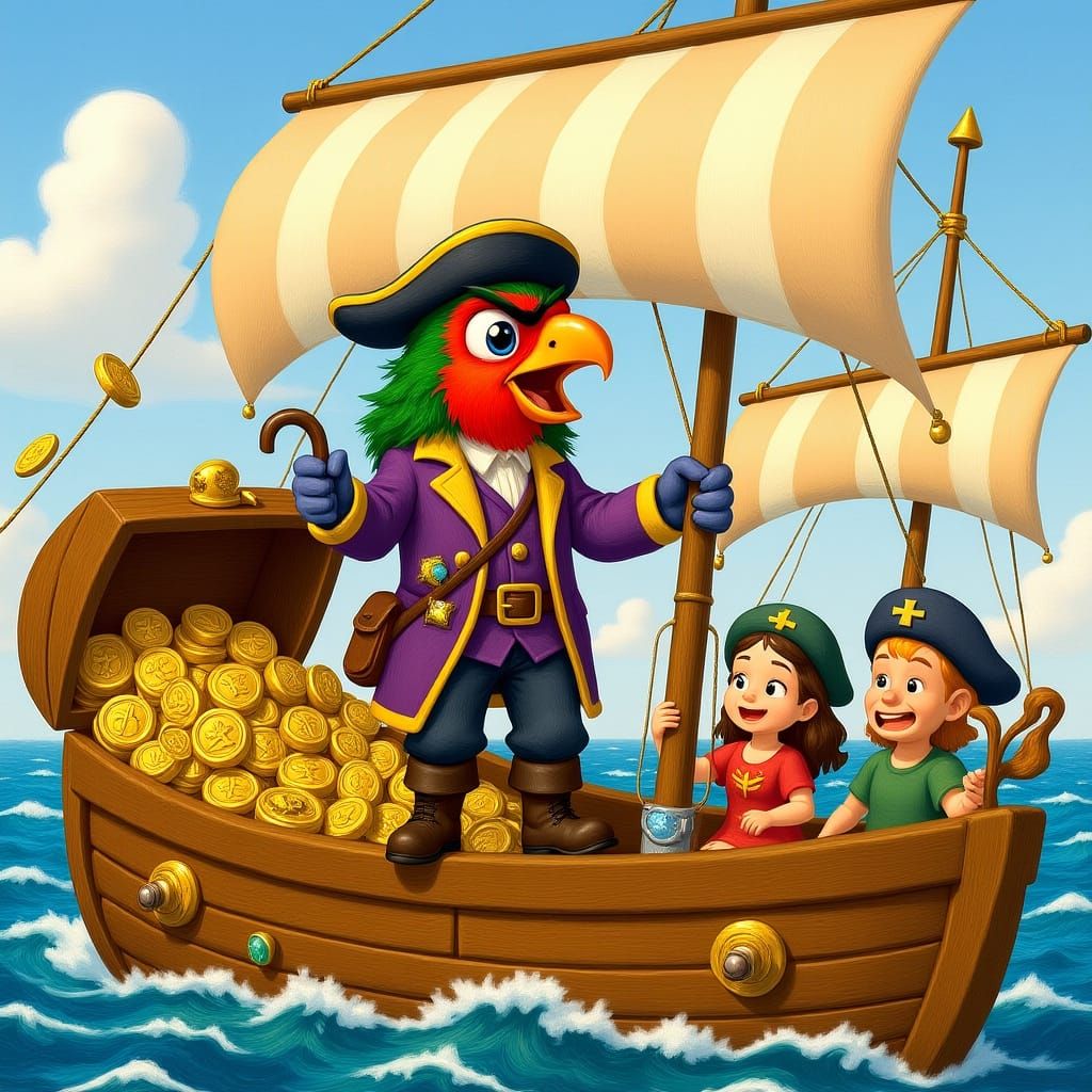 A vibrant parrot pirate captain sits on a treasure chest full of jewels. This whimsical image evokes a painterly style, reminiscent of classic children's book illustrations.