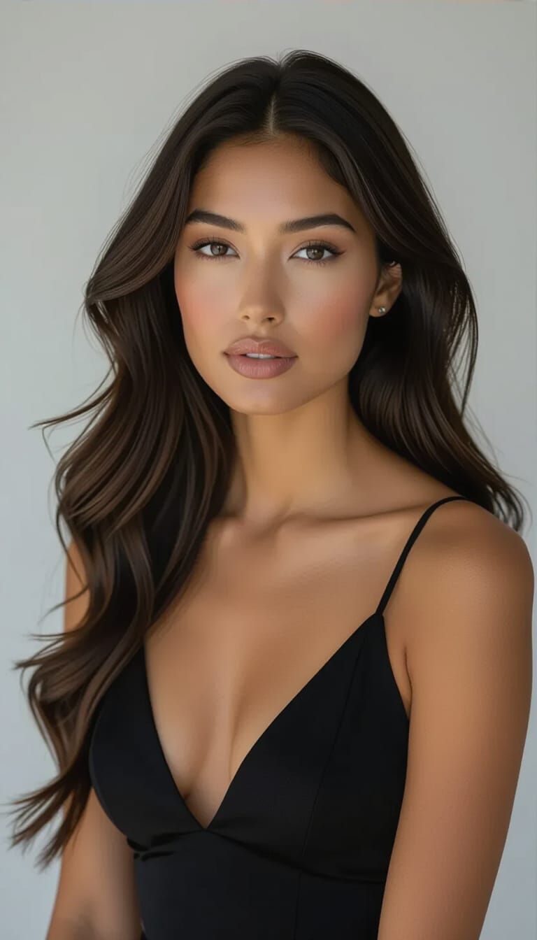 This image shows a beautiful American-Indian woman with flowing dark hair, posing in a fitted black dress. The ultra-realistic portrait evokes high-quality fashion photography with soft makeup and subtle accessories.