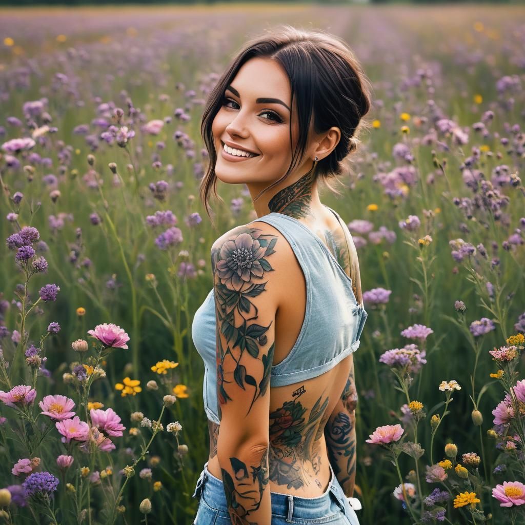 This image shows a tattooed woman with a gentle smile walking through a flower-filled meadow. The composition emphasizes her body language and serene expression.