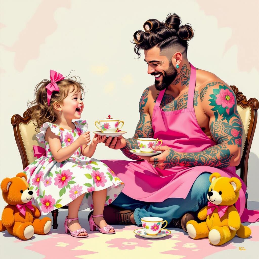 A happy little girl in a floral dress and heels enjoys a whimsical tea party with her stuffed animals and her large, tattooed father. The scene bursts with vibrant, pastel colors and bold lines.