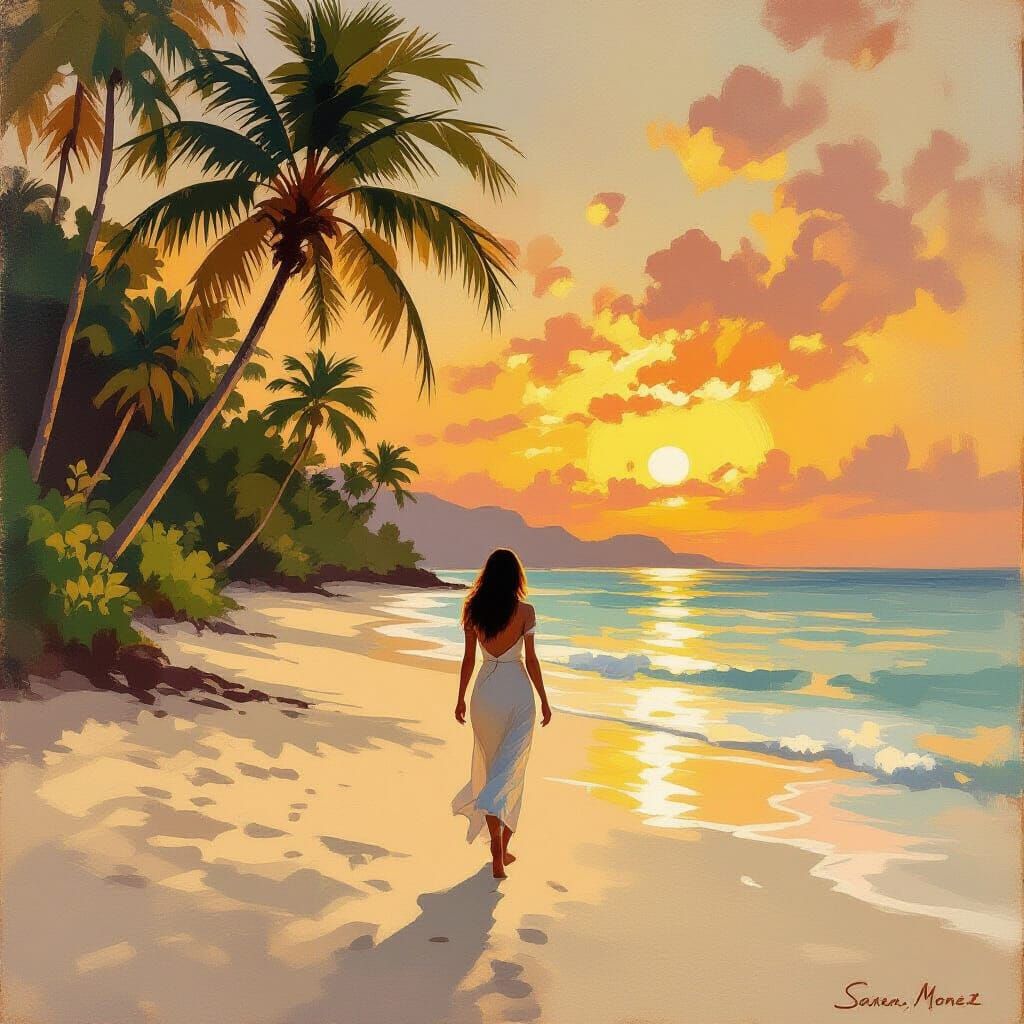 A serene scene of a woman walking on a palm-lined beach at dusk. The painting evokes an impressionistic style with warm colors and soft brushstrokes, reminiscent of 19th-century landscape painting.