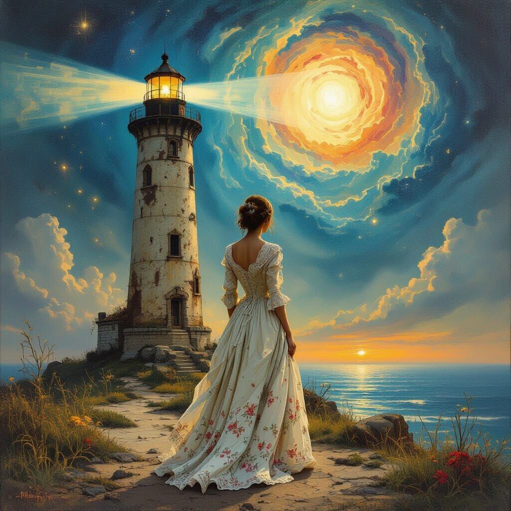 A lone woman in a vintage dress stands before an ancient lighthouse. Its beam pierces a cosmic nebula, rendered with expressive oil strokes and vivid color gradients.