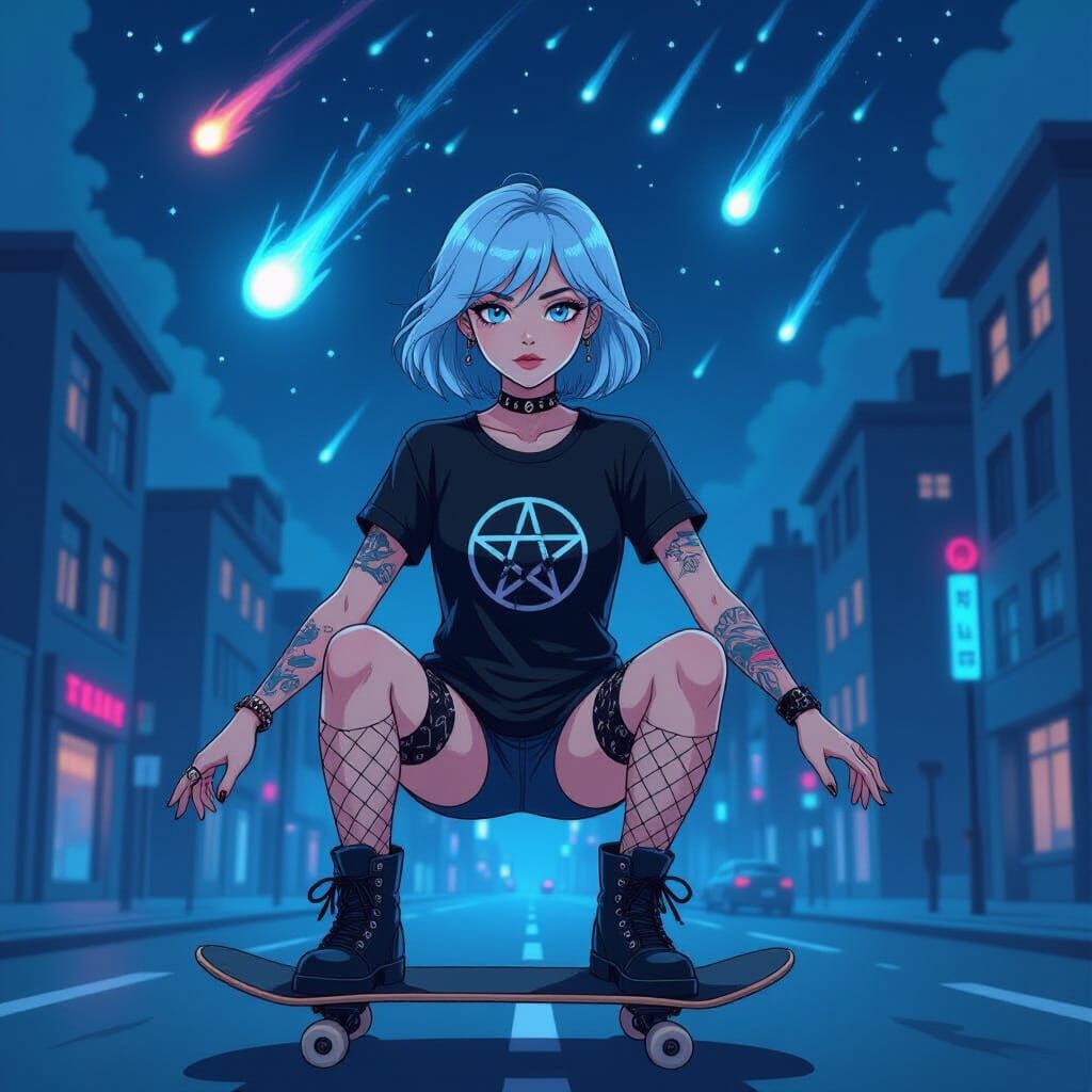 A digital illustration of a woman with short hair and wing tattoos skateboarding through a city at night, with meteorites falling. The image has a surreal, minimalist style with a manga-inspired aesthetic.