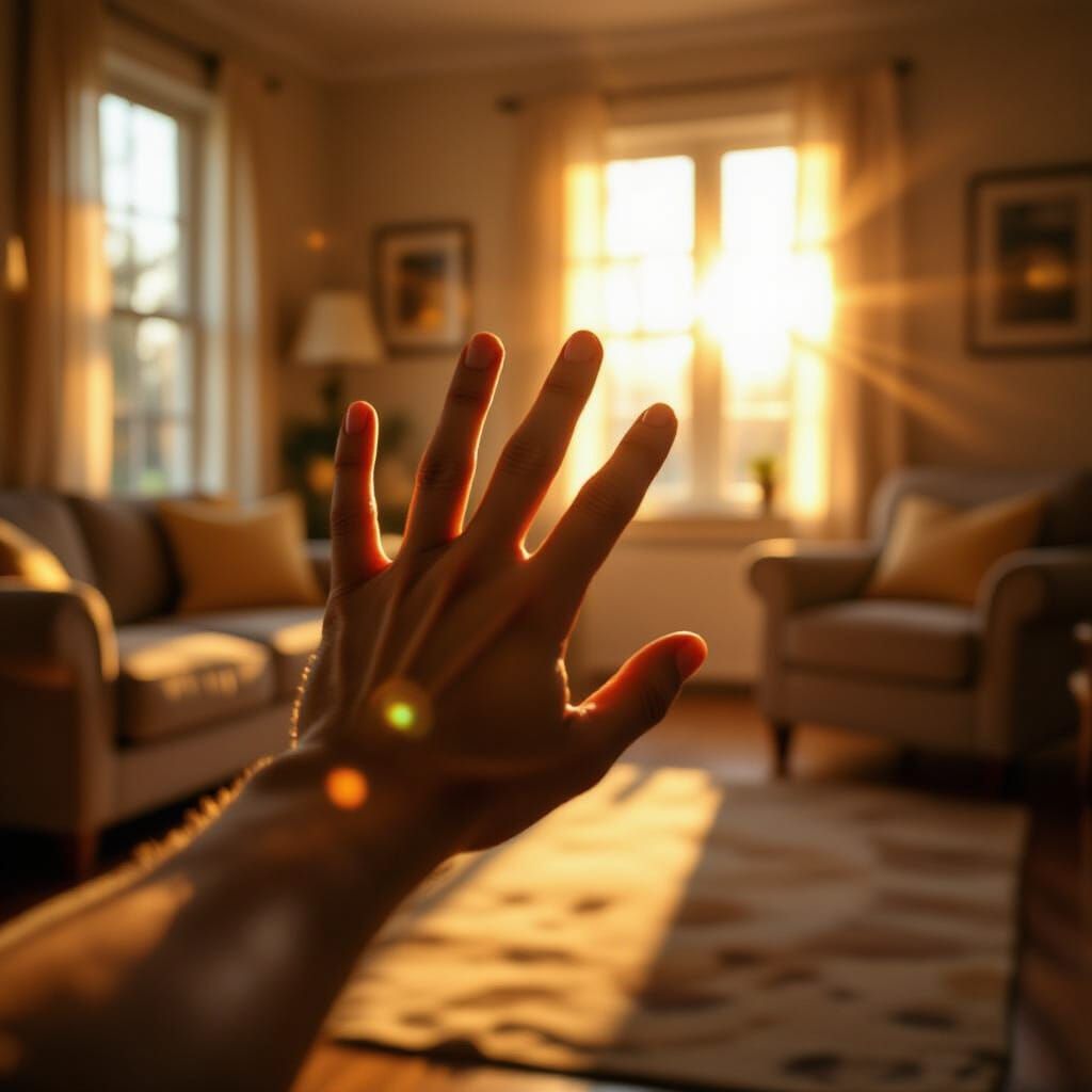 This image shows a realistic low-angle shot of a hand reaching towards the viewer, bathed in warm sunlight. The background is softly blurred, creating a dramatic and intense atmosphere.