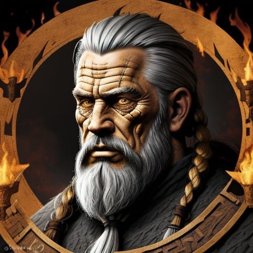 A close-up image of an imposing Viking leader performing on stage with a stick. The artwork features a Nordic folk art style, with flame-lit features, braided beard, and dramatic lighting.