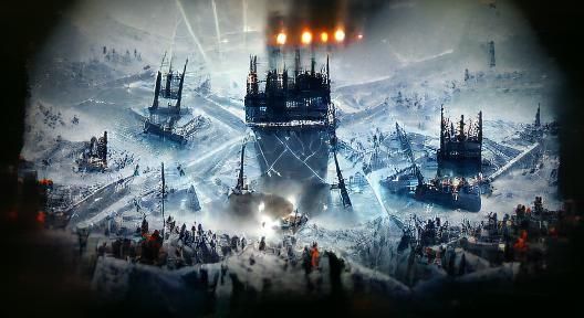 This image shows a stark, frozen landscape under a dark sky. The scene evokes a sense of desolation and the struggle for survival against extreme cold.