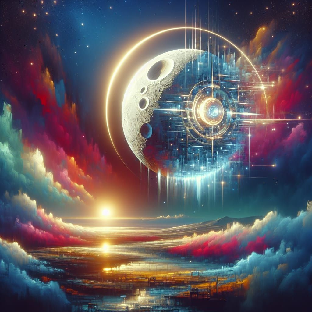 A striking picture of a holographic moon module hovering over a landscape. This image captures the futuristic design with meticulous detail, enhanced by vibrant colors and high contrast in a graffiti art style.