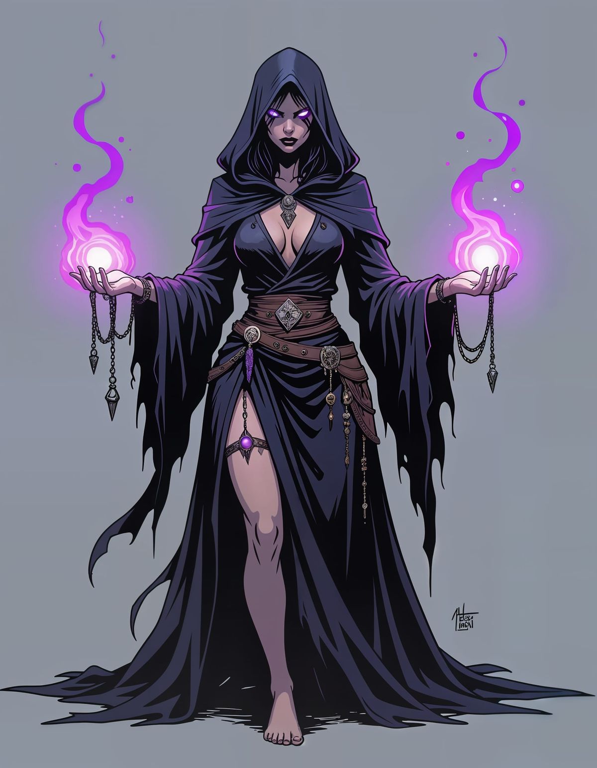 This image shows a comic book style portrait of a sorceress. The villainess wears a dark robe adorned with sigils, and violet energy crackles around her hands.