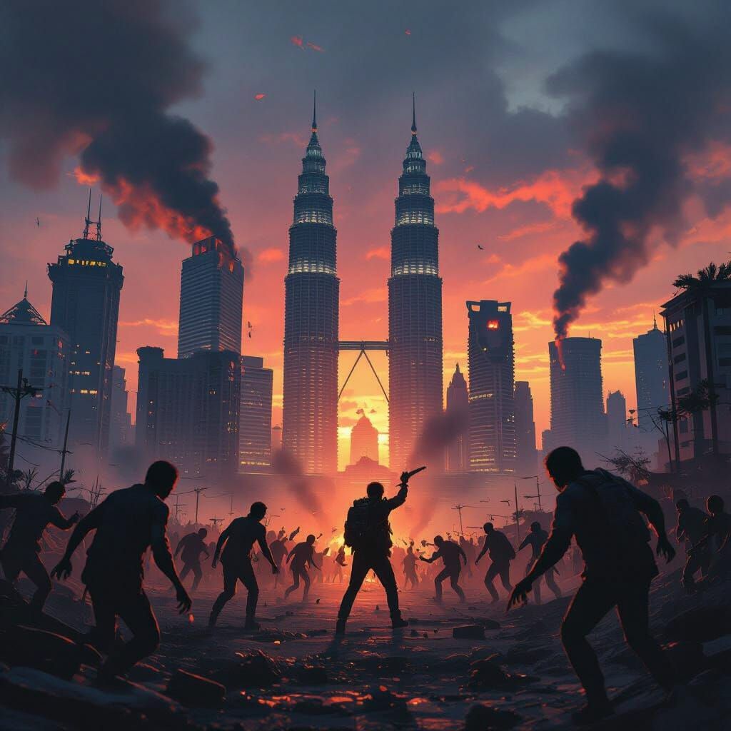 A harrowing digital matte painting depicts a zombie-infested Malaysian city at sunset. Iconic skyscrapers are shrouded in smoke as a lone survivor navigates the chaos, rendered with dramatic lighting and a grim, post-apocalyptic color scheme.