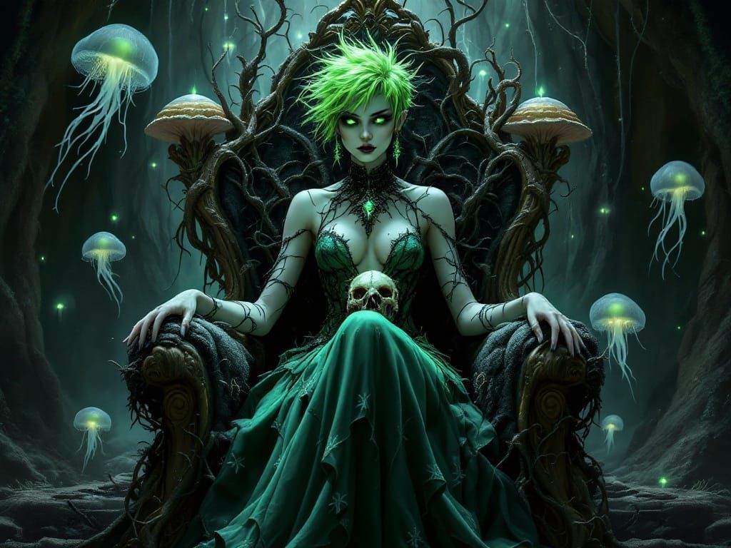 A gothic fairy with neon green hair sits on a vine throne in a mushroom-lit room. She wears a spider silk gown and holds a dragon skull scepter in a dark fantasy style.