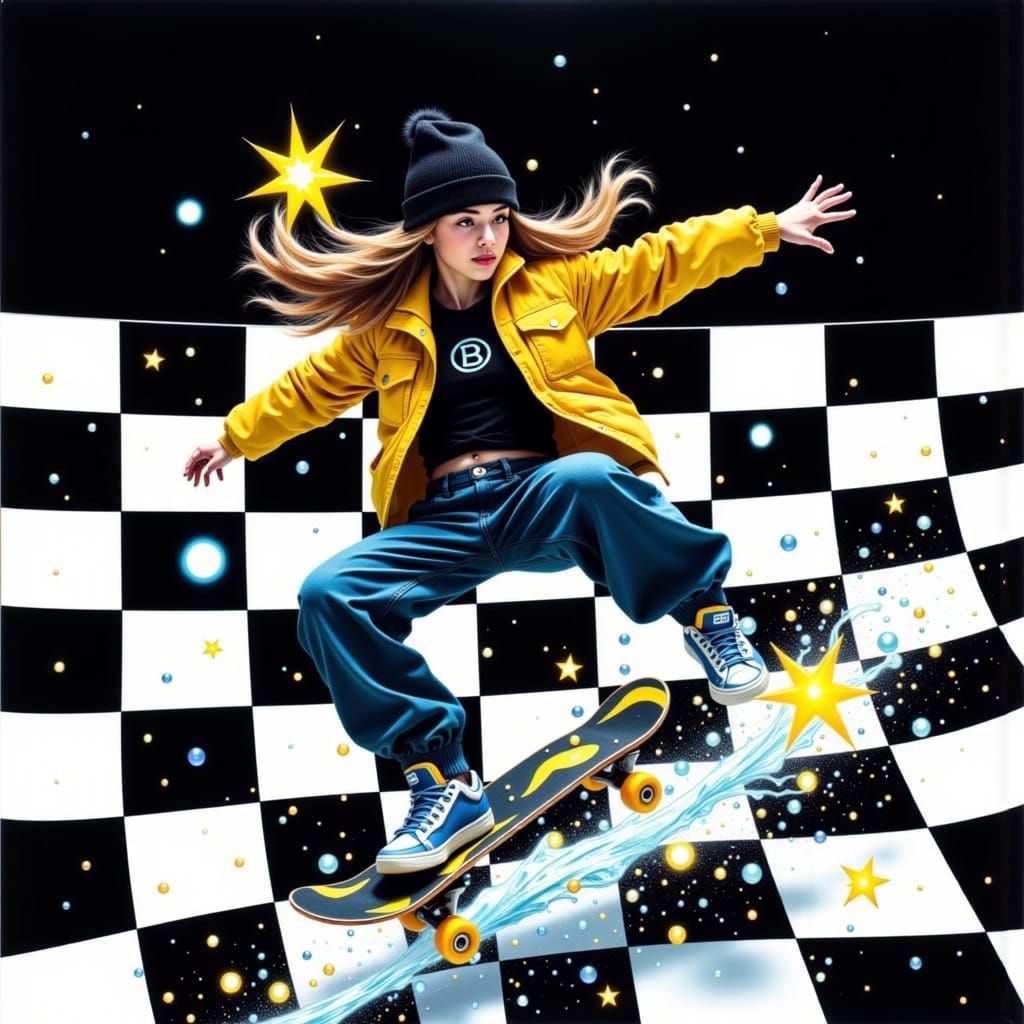 A dynamic shot of a female skater airborne against a checkered backdrop. This image captures a hyperrealistic scene with neon accents, detailed textures, and a nostalgic retro aesthetic.