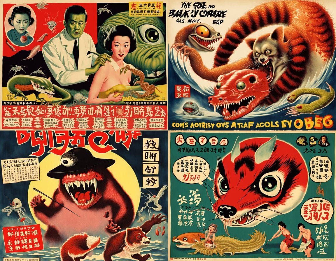 This image shows a grotesque mutant geisha in a 1950s movie poster style. The horror-themed design features bizarre hybrid anatomy and nightmarish elements.