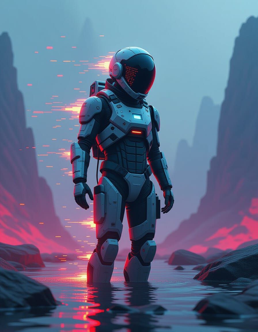 This image shows a futuristic figure experiencing a digital glitch, resulting in their body dissolving into vibrant static in a distorted world. Rendered as 3D digital art with inverted colors.