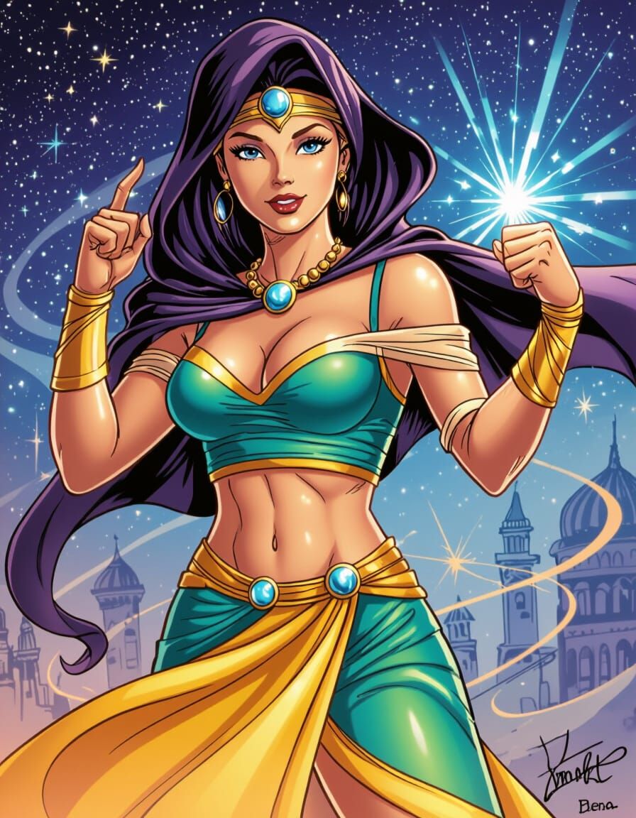 This image shows Princess Jasmine reimagined as a superhero in a vibrant comic book style. The artwork evokes classic acrylic painting techniques, reminiscent of comic art.
