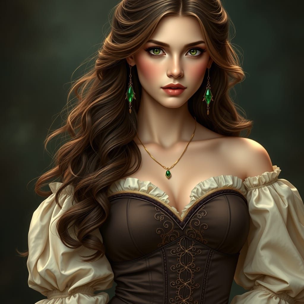 This enchanting portrait of a young woman showcases her beauty in a medieval-style dress, with intricate details and textures reminiscent of Renaissance art. Soft focused background and delicate makeup add to the romantic atmosphere, while the subject's piercing green eyes and seductive expression evoke ...