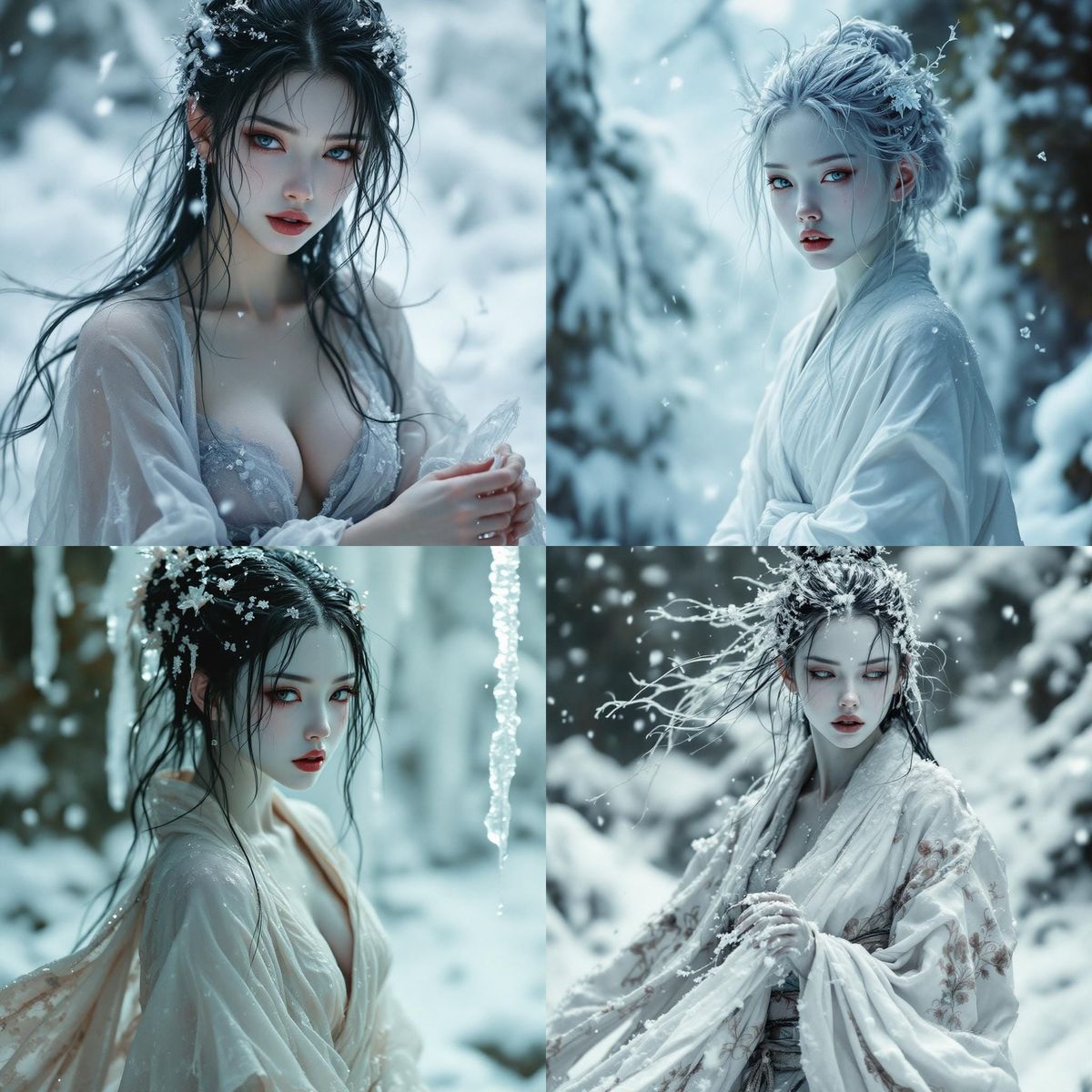 This image depicts a beautiful, fierce Yuki-Onna, a snow spirit. She is rendered with pale skin and a cold, wet appearance, embodying a hyper-feminine temptress.