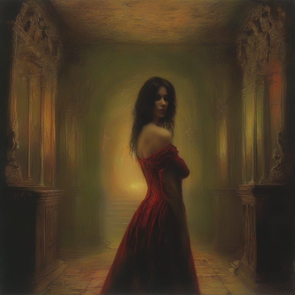 This image shows a mysterious gothic woman with long dark hair and glowing green eyes, wearing a corset, in a misty, candlelit chamber with rich, bold red accents and deep shadows.
