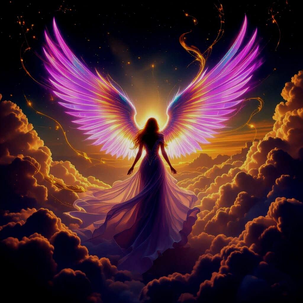 This image features a celestial angel with opalescent wings, surrounded by golden ethereal mist and cosmic elements. The artwork utilizes a vibrant neon purple and pink color palette with macro photography detail.