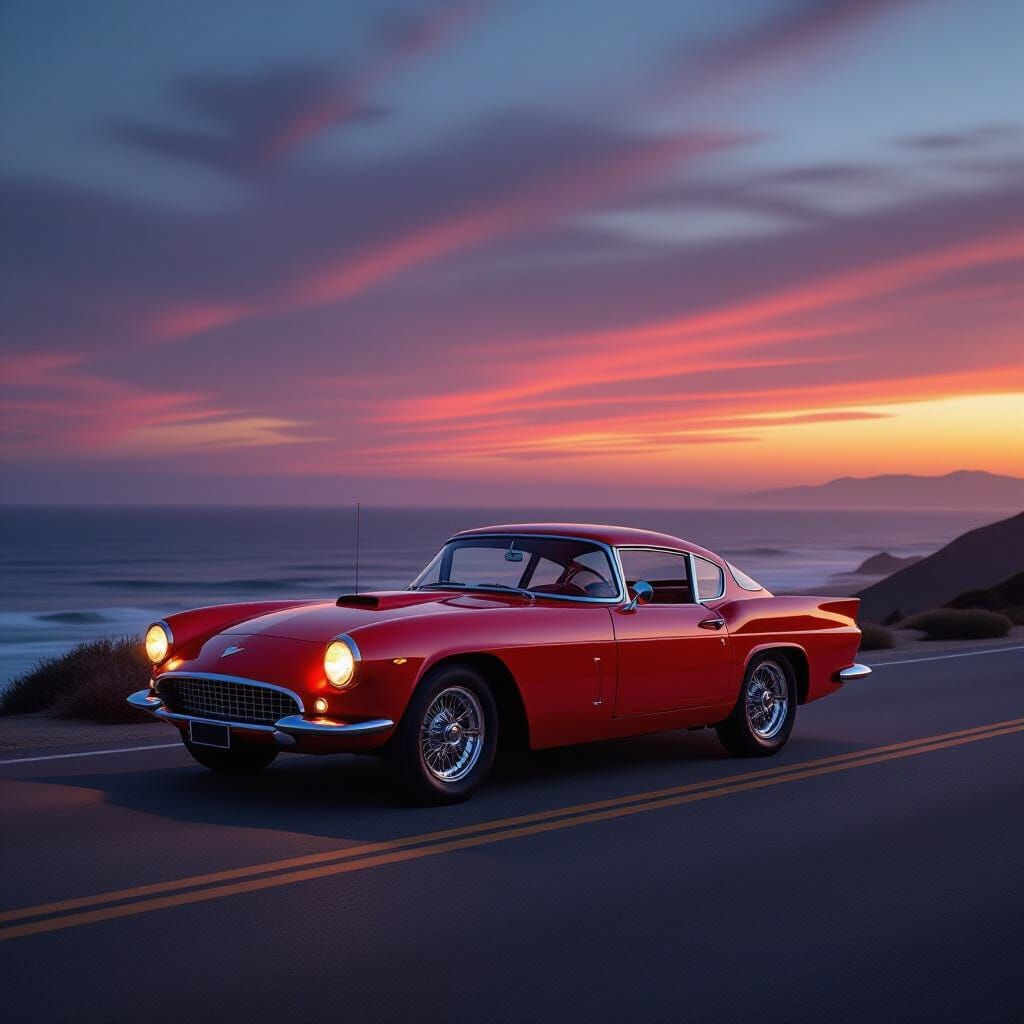 This image shows a vintage red sports car on a deserted coastal highway at sunset. The scene features a dramatic sky and emphasizes the car's sleek design with cinematic lighting.